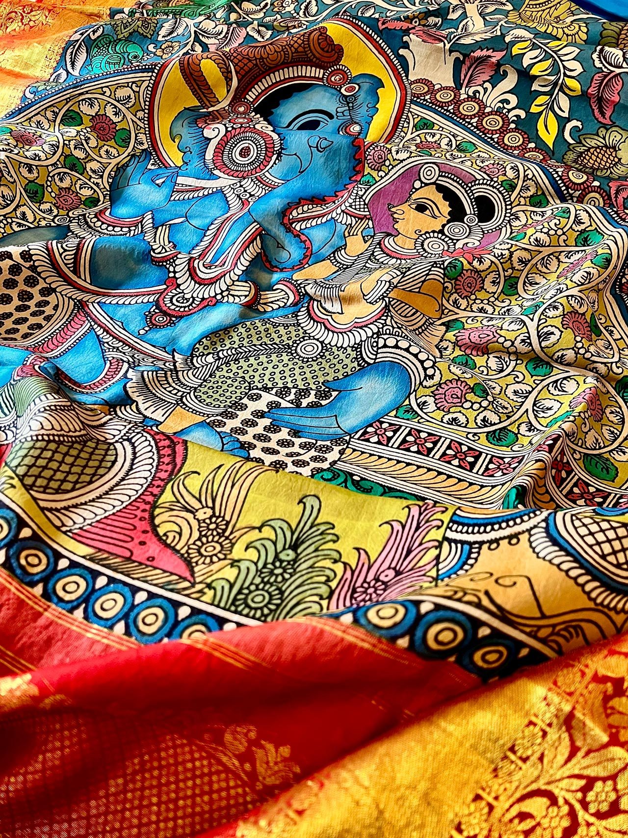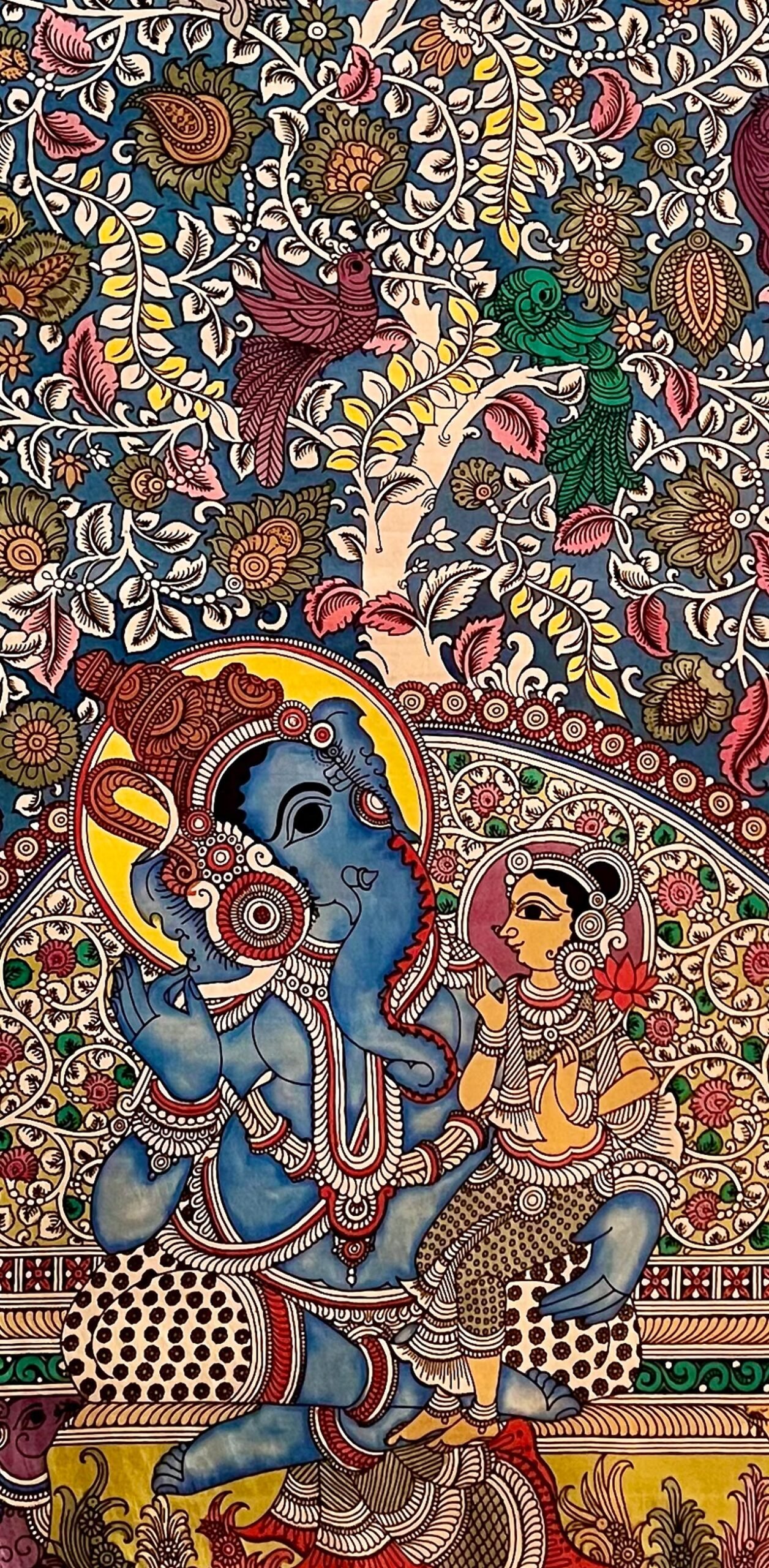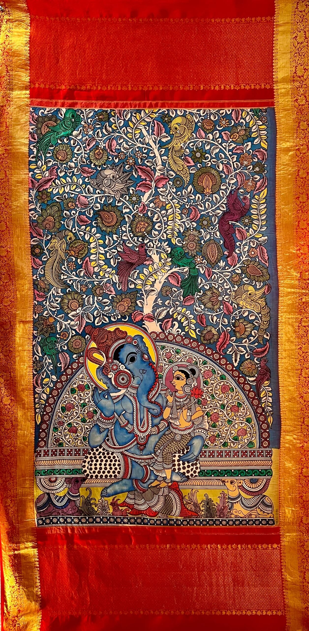 ‘Anandavatī’ celebrates companionship, compassion, and shared joy. It depicts Lord At its heart sit Lord Ganesha and his consort Siddhi — he, the remover of obstacles; she, the embodiment of spiritual power and fulfilment. Together, they symbolize the union of wisdom and transcendence. Set not within a grand temple, but in an orchard brimming with life, the scene honours divinity in its most human and tender form. Flora and fauna gather as quiet witnesses to this serene and abundant harmony.